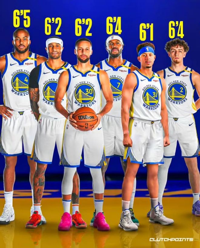 勇士完成这‘15+3’名单后,球队阵容中有7个后卫:库里1.91米,小库里1.88米、波杰姆斯基1.93米、小佩顿1.91米、希尔德1.93米、穆迪1.96米。这7位后卫的身高都没有超过1.98米的,这就是科尔喜欢的矮小阵容。